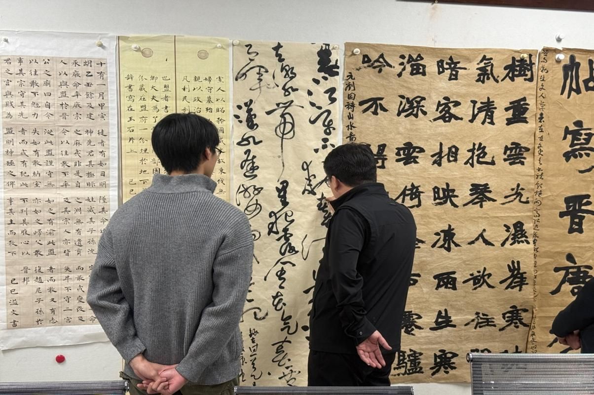在作品点评环节,学生依次挂好自己的作品,曹老师立足不同书体的艺术规律与审美标准,从整体视觉呈现、用笔、用墨、章法四个关键维度,对每幅作品进行细致剖析。曹老师指出了每位学生当前存在的不足,又提供改进思路,帮助学生建立起更系统的创作认知。